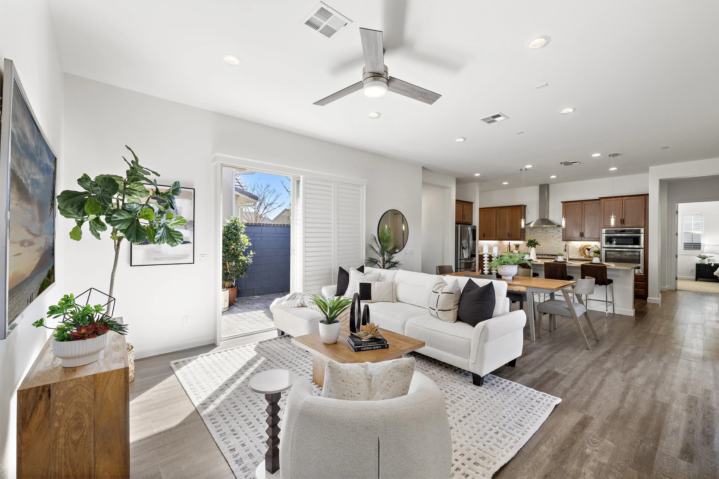 Welcome to this exceptional single-level residence, impeccably upgraded and truly move-in ready. Set on one of the largest lots in the community, this home offers an ideal blend of style, comfort, and indoor-outdoor living. The thoughtfully designed floor plan features two bedrooms, two bathrooms, and a generous office/den, along with a full driveway for added convenience. The wrap-around backyard is perfectly suited for entertaining, showcasing custom pavers, a built-in fire pit, and a covered California room with expansive sliding doors that seamlessly connect the indoors to the outdoors—all with minimal yard maintenance required.